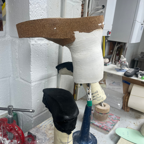 Once Victoria receives the prescription and cast from the orthotist, she fills, cures, and carefully smooths it. She then builds out the toe shape using cork, considering not only anatomical accuracy, but also how the final shape will affect comfort, function, and long-term wear for the patient.