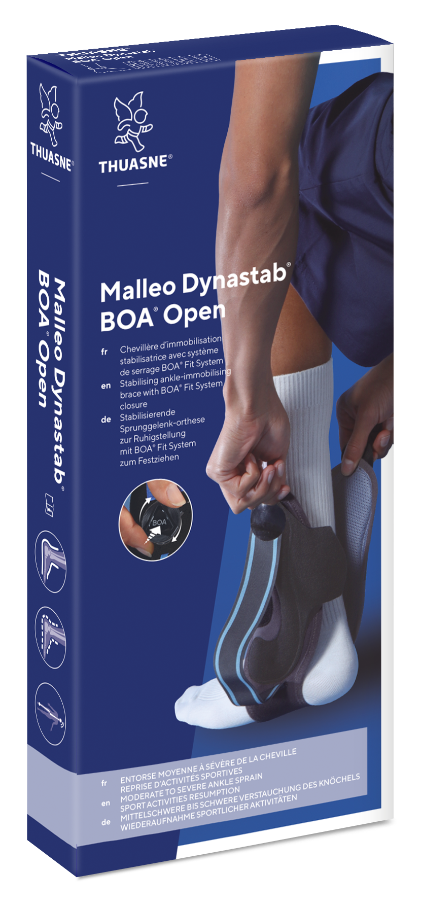 The MalleoDynastab® BOA® Open is a stabilising ankle brace designed for those needing reliable support for moderate to severe ankle sprains or chronic ankle instability. With its low-profile design, it fits comfortably into most shoes, making it a great option for both everyday activities and sports.